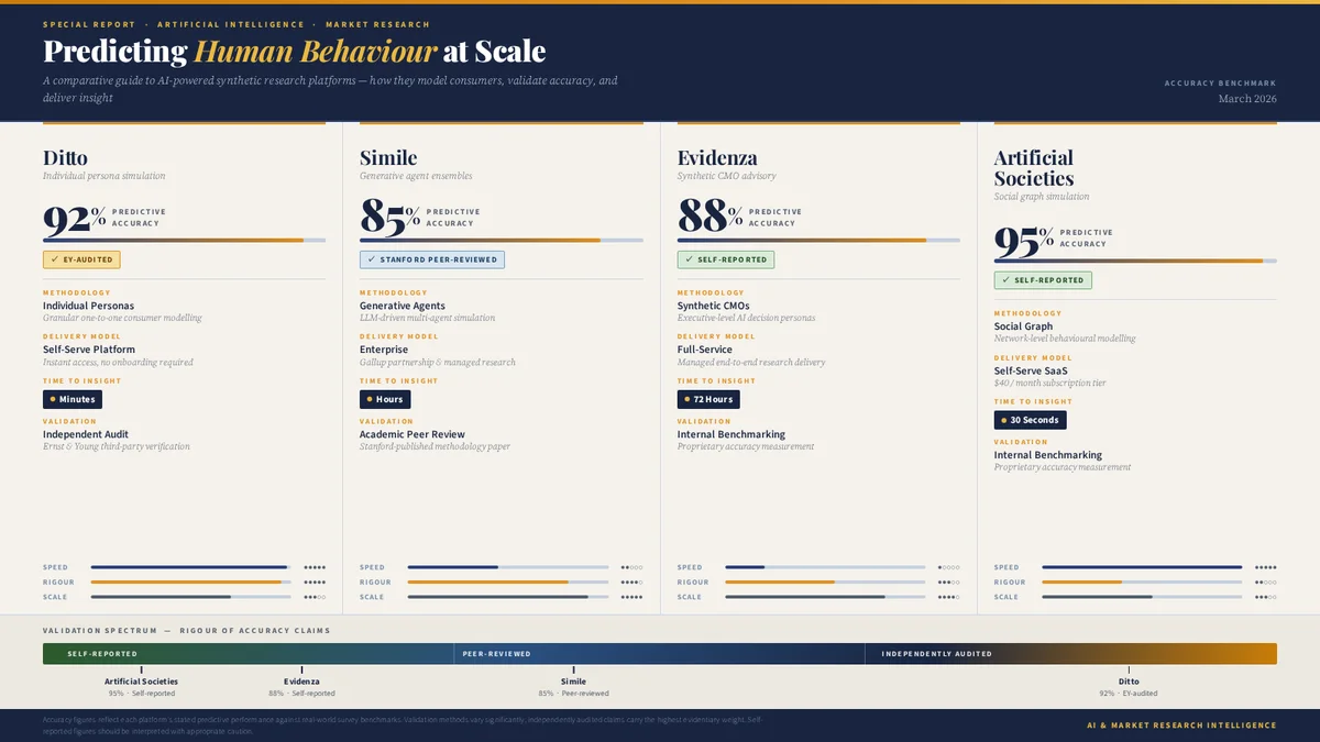 The four platforms in this market have each made a different bet about how to build this capability. Ditto has bet on census-grounded individual personas with independent validation and self-serve access. Simile has bet on generative agents with academic rigour and Gallup's probability-based panels. Evidenza has bet on enterprise consulting with marketing luminary AI clones. Artificial Societies has bet on social graph simulation at a radically low price point. Each approach has genuine merit, and the optimal choice depends on your use case, your budget, your procurement requirements, and your tolerance for nascent technology.
