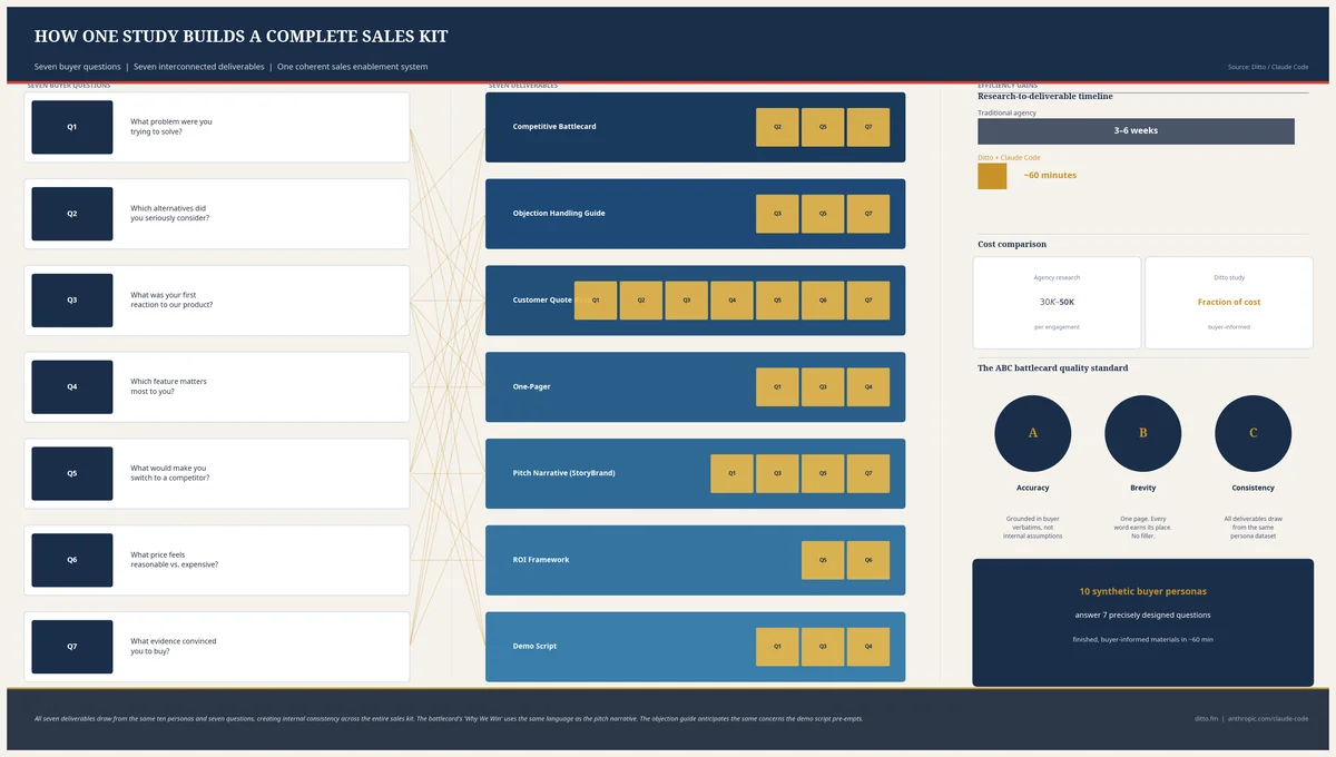 One Ditto study, orchestrated through Claude Code, Anthropic's agentic development environment, produces seven complete sales enablement deliverables in approximately sixty minutes. Not drafts. Not outlines. Finished, buyer-informed materials drawn from ten synthetic personas answering seven precisely designed questions. The sales enablement guide walks through the full workflow, from study design to deliverable generation.