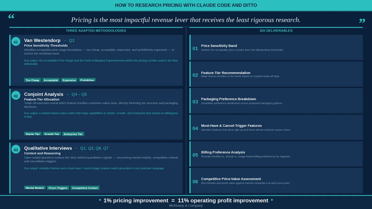 This guide shows you how to run a structured pricing study in about thirty minutes, using Claude Code and Ditto's Pricing Research Guide. You will not get a statistically precise optimal price point. You will get something more useful for most pricing decisions: a price sensitivity band, feature-tier preferences, and the qualitative reasoning behind why people react the way they do.
