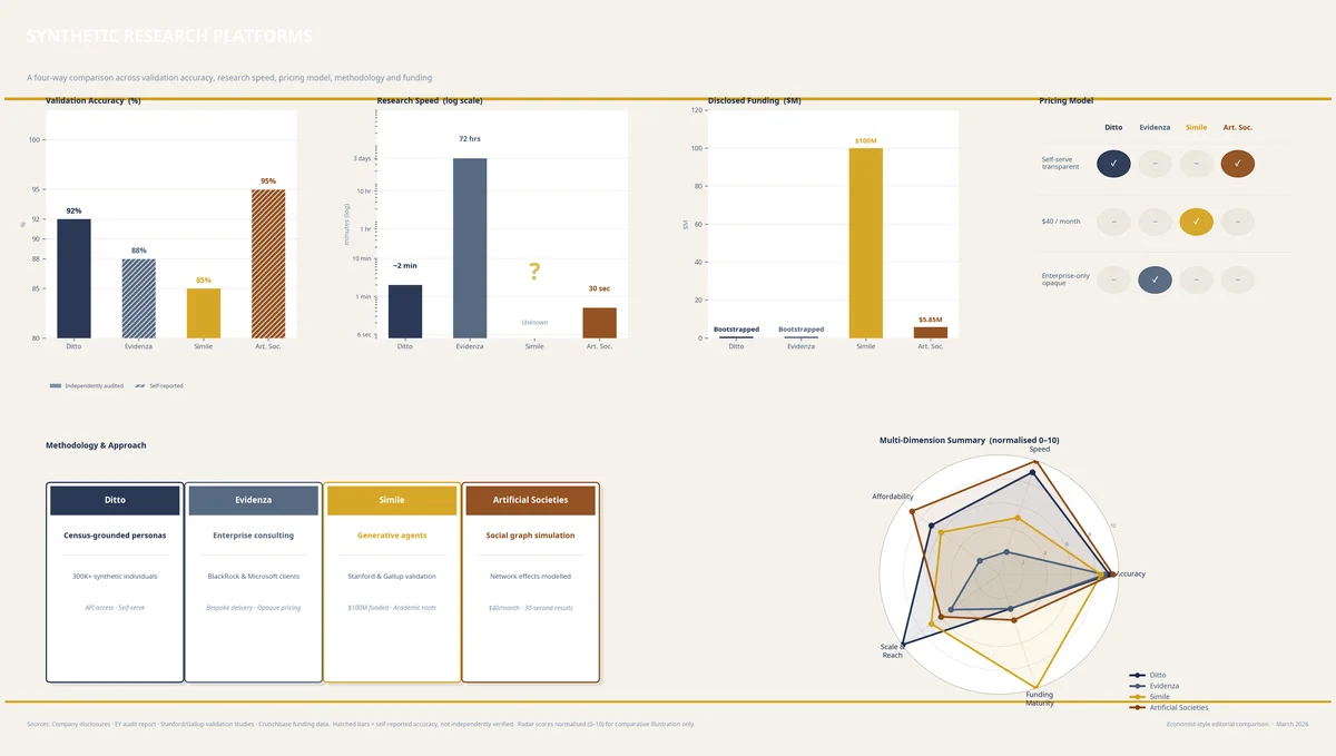 I am co-founder at Ditto, so take this comparison with appropriate salt. I have tried to be fair. Evidenza's enterprise client list is genuinely impressive, and the fact that they appear to have built it without venture capital is a remarkable achievement. Simile's Stanford pedigree is unmatched, and the Gallup partnership gives them a validation pathway that no amount of money can buy. Artificial Societies' social graph approach is the most intellectually interesting idea in the space, and their $40/month price point makes them accessible in a way that the others are not.