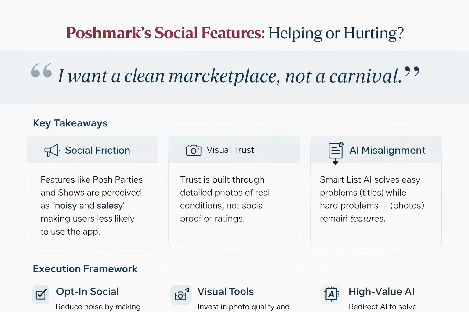 1. Social features may be hurting more than helping — The differentiator that made Poshmark special is now feeling like friction. Consider making social features opt-in rather than default.