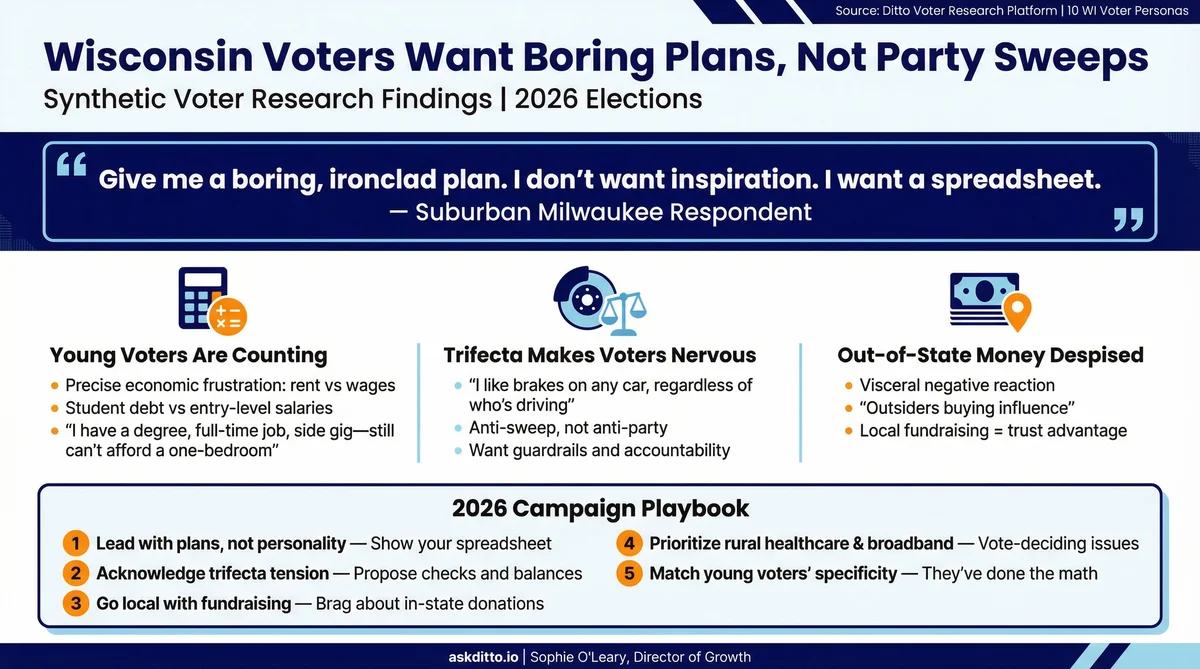 Wisconsin is one of those states where voters take their politics personally - and seriously. So when we built a voter research study with 10 synthetic Wisconsin voters, I expected strong feelings about the governor's race and the state's trifecta. What I did not expect was how many of them would use the word boring as a compliment.